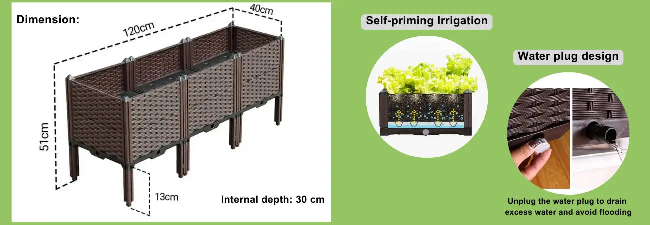 Picture your outdoor space filled with vibrant flowers, fresh herbs, and crisp vegetables, all thriving in the 120 cm Deep Raised Planter Box. The self-watering feature keeps your plants healthy, while the modular design allows you to adapt the planter to suit your needs. Whether you're working with a small balcony or a large terrace, this planter box fits right in and makes gardening more enjoyable.