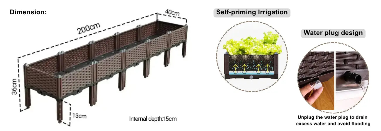 This planter box is perfect for those looking to make the most of limited outdoor space while maintaining a beautiful and functional garden. Features a smart self-watering design, helping you conserve water and ensuring your plants remain hydrated without frequent attention, while the durable construction ensures that it stands up to the elements. The large capacity gives you the flexibility to plant a variety of crops, and the stylish design adds a modern touch to your outdoor environment. Whether you're growing vegetables, flowers, or herbs, this planter is the ideal gardening companion.