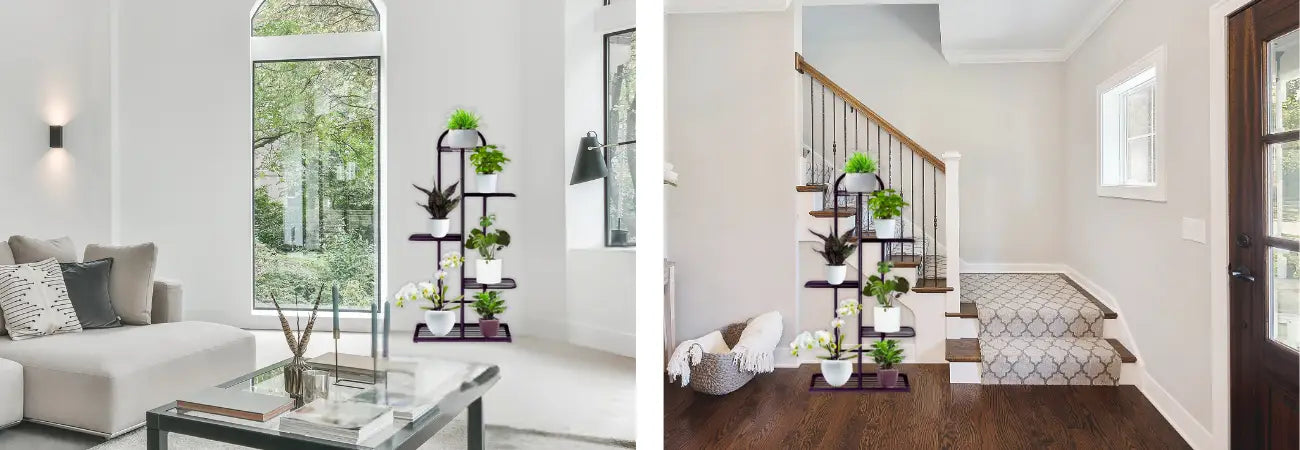 Each tier features a concave surface with guardrails to keep planters securely in place, preventing slips or accidents. The sturdy metal frame ensures stability while adding a modern touch to your decor.